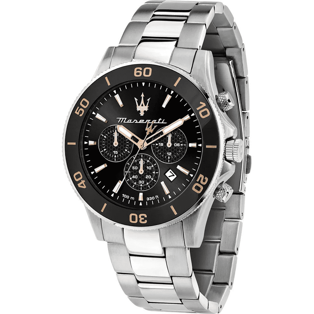 Herrenuhr Maserati Sfida R8853140005, Quarz GMT. Edelstahlgehäuse 44 mm, schwarzes Zifferblatt, Mineralglas. Edelstahlarmband mit Sicherheitsverschluss. Wasserdichtigkeit 10 ATM. Geliefert in offizieller Maserati-Box, 2 Jahre Garantie. Sfida-Kollektion: robustes Design, großes Gehäuse mit drehbarer Lünette/Tachymeter und Knurling-Finish.