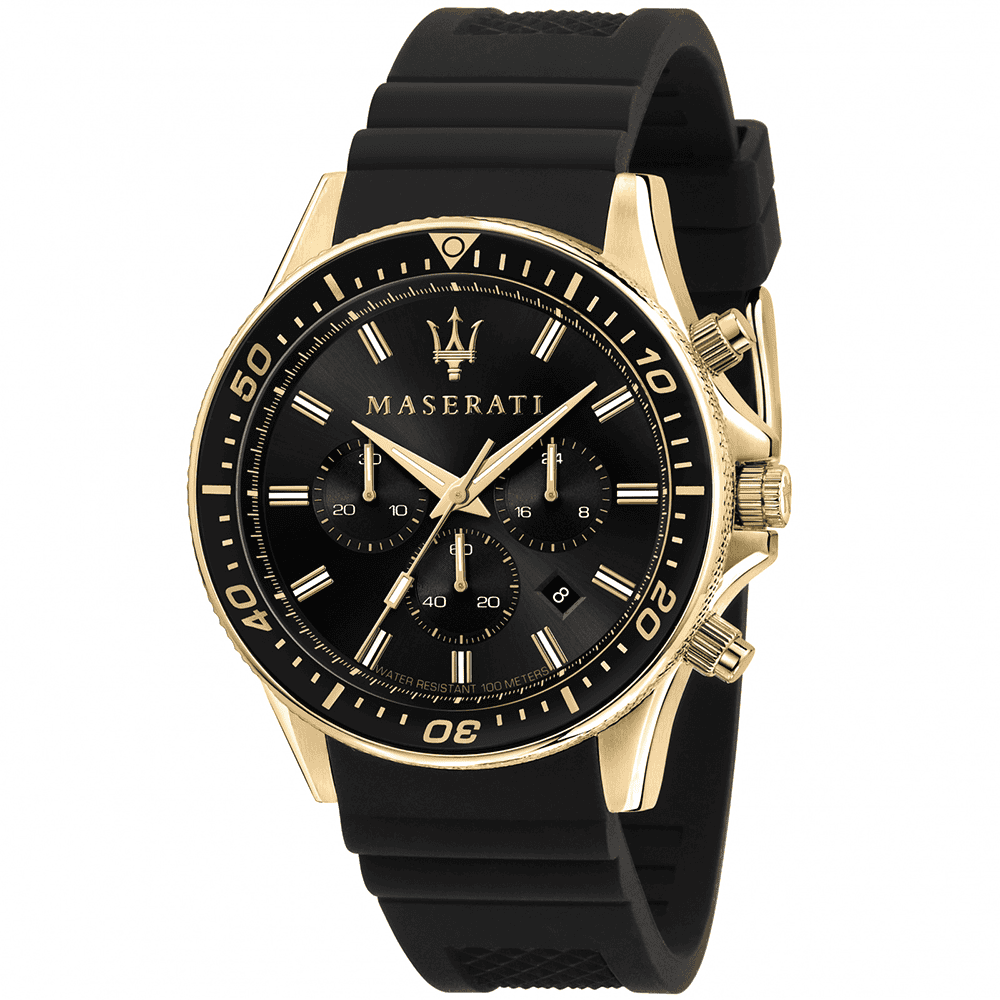 Herrenuhr Maserati Sfida R8871640001, Quarz-Chronograph MIYOTA JS25. Gehäuse aus goldfarbenem PVD-Edelstahl, 44 mm, schwarzes Zifferblatt, Mineralglas. Silikonarmband mit Dornschließe. Wasserdicht bis 10 ATM. Geliefert in offizieller Maserati-Box, 2 Jahre Garantie. Die Sfida-Kollektion zeichnet sich durch ein kraftvolles Design, eine drehbare Lünette/Tachymeter und moderne Oberflächen aus.