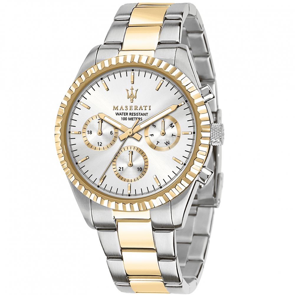 Herrenarmbanduhr Maserati Competizione R8853100026, Quarz, multifunktional, aus Edelstahl mit gelber PVD-Beschichtung. Rundes Gehäuse mit 43 mm Durchmesser, blaues Zifferblatt mit Mineralglas, Edelstahlarmband mit Faltschließe. Wasserdicht bis 10 ATM. Geliefert in der originalen Maserati-Box, mit 2 Jahren Garantie.