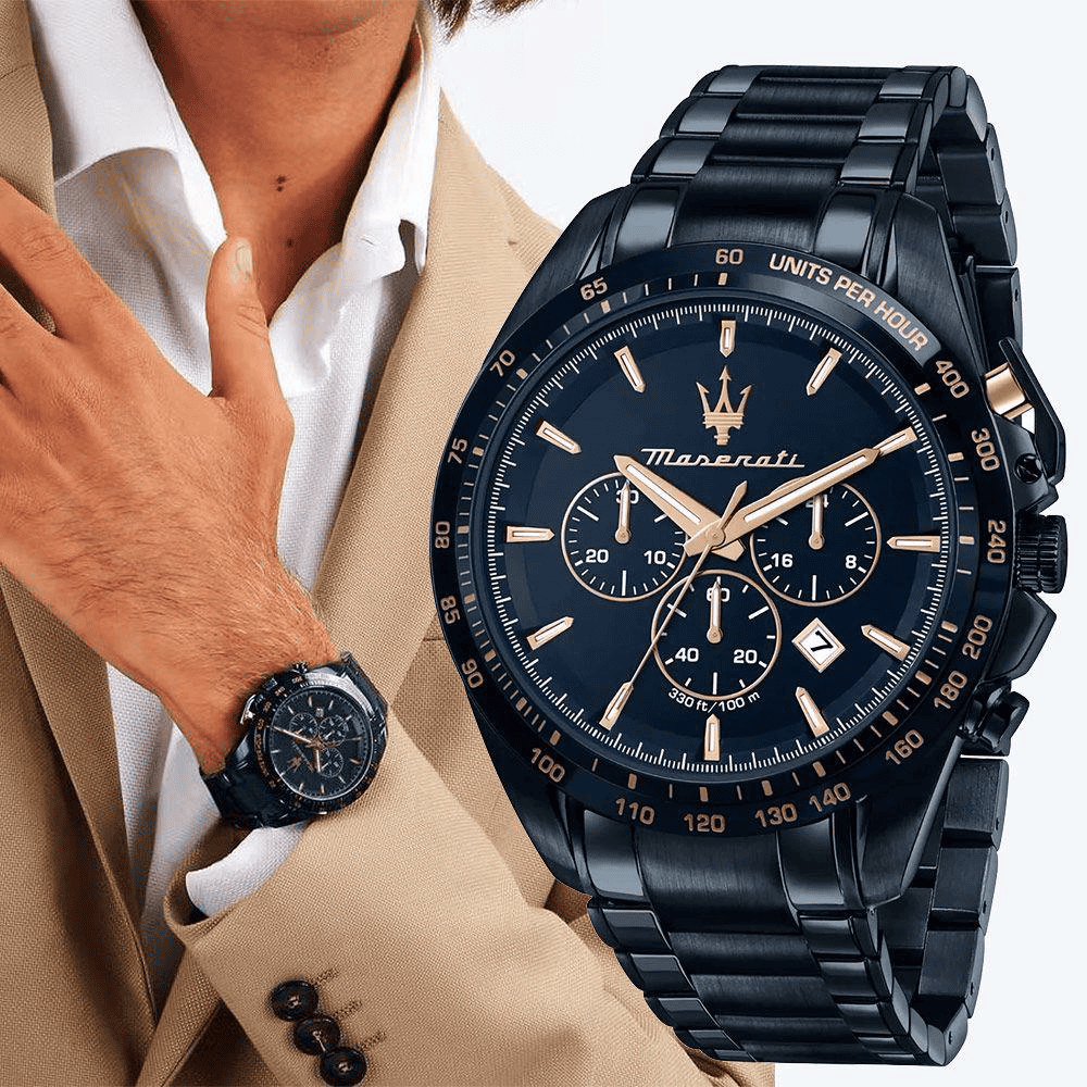 Maserati Herrenuhr, Ref. R8873612054, aus der BLUE EDITION Kollektion, aus Edelstahl, Quarzwerk, Chronographenfunktion. Die Uhr verfügt über ein Silikonarmband mit Faltschließe. Das Gehäuse der Uhr misst 45,00 mm, umgibt ein blaues Zifferblatt mit roségoldenen Indizes und ist mit einem widerstandsfähigen Mineralglas ausgestattet. Wasserdicht bis 10 ATM.