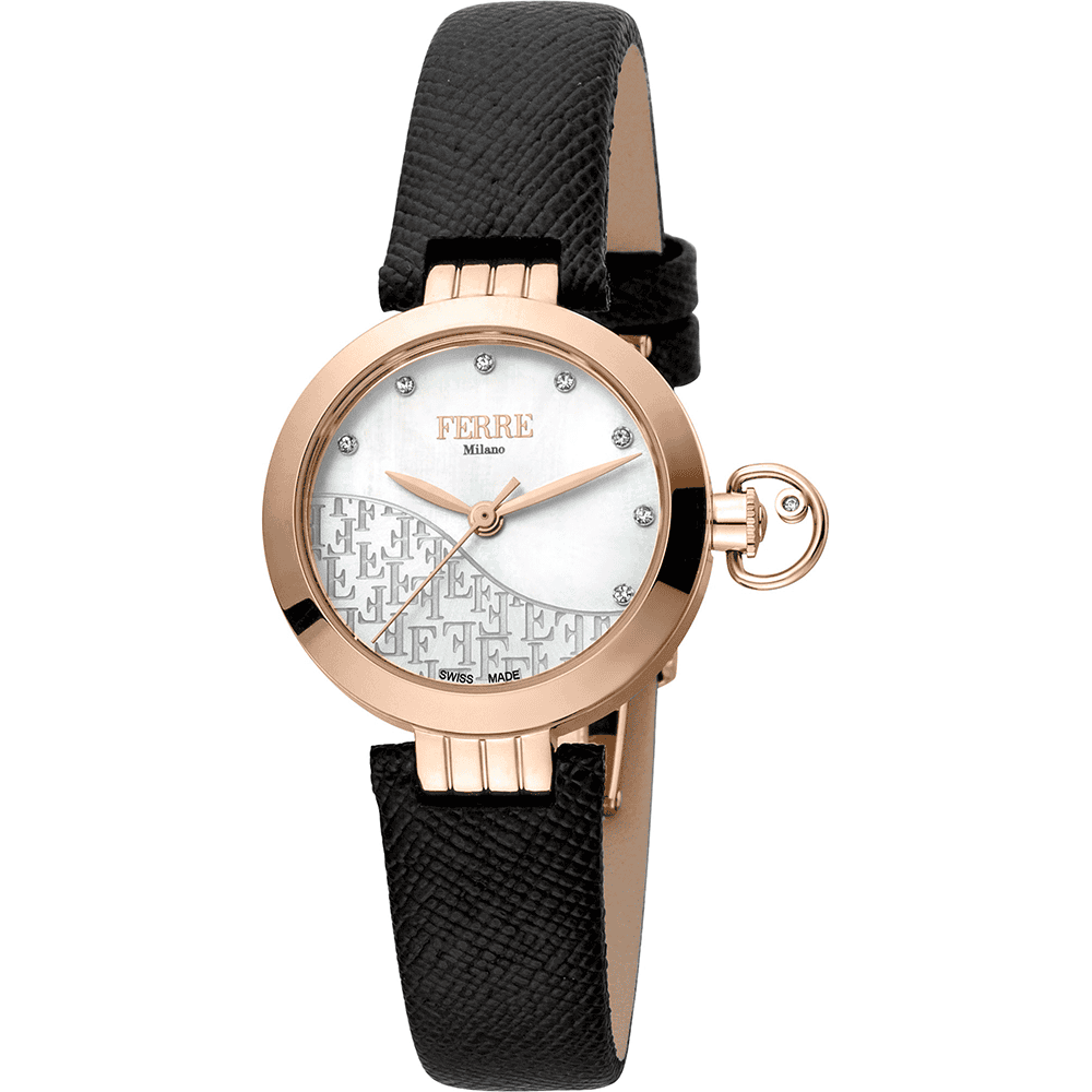 Ferre Milano Ronda Rose Gold mit weißem Perlmutt-Zifferblatt ist eine Damenuhr mit Quarzwerk und analoger Anzeige. Sie verfügt über ein 28 mm Edelstahlgehäuse mit Roségold-Finish und ein schwarzes Lederarmband. Das weiße Perlmutt-Zifferblatt wird von einem Mineralglas geschützt. Die Uhr bietet eine HMS-Funktion (Stunden, Minuten, Sekunden) und ist bis zu 3 ATM wasserdicht.