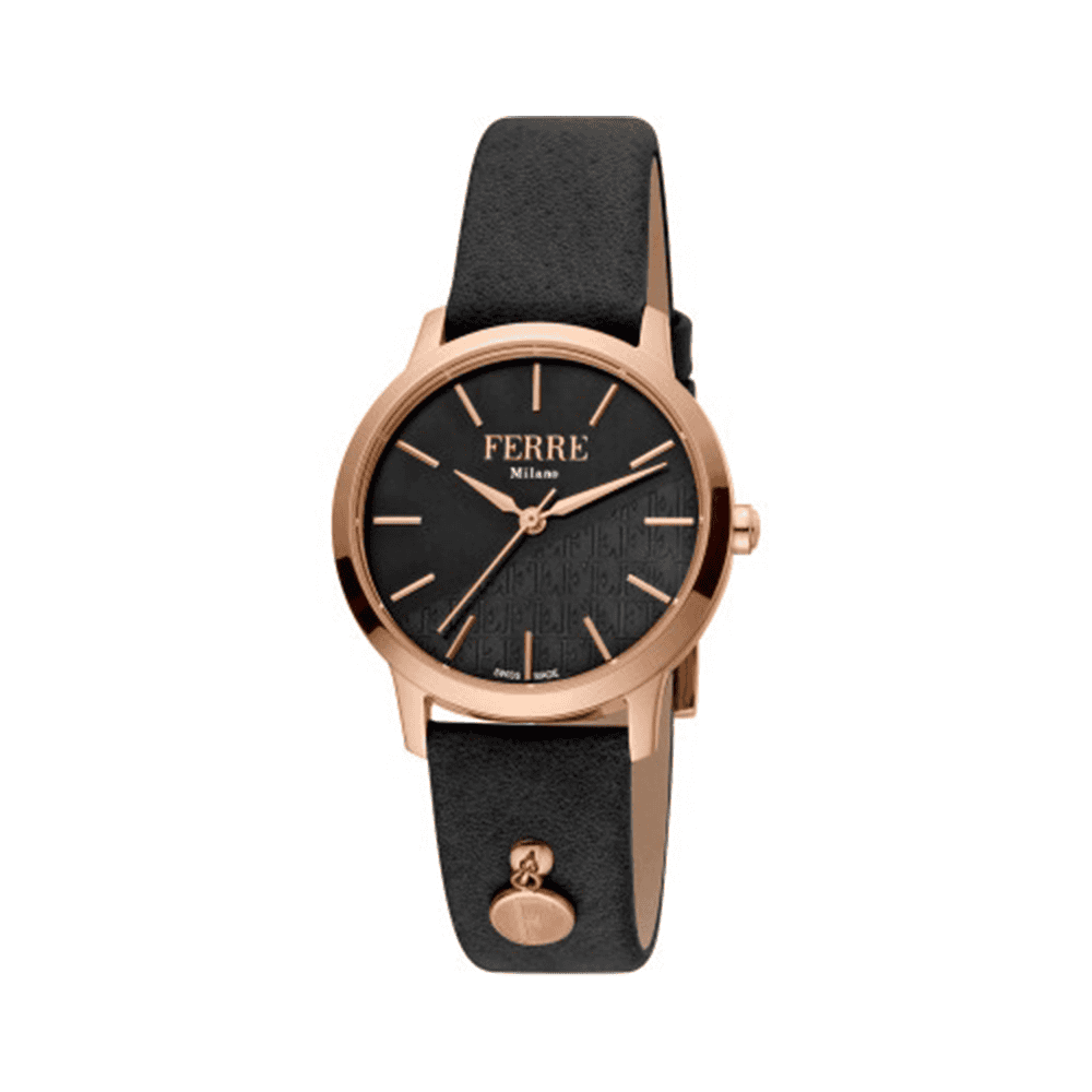 Ferre Milano FM1L152M0091 – eine raffinierte Damenuhr mit elegantem schwarzem Zifferblatt, einem 32 mm Gehäuse aus Edelstahl in Roségold-Finish und einem Metallarmband. Ausgestattet mit einem präzisen Quarzwerk, widerstandsfähigem Mineralglas und einer Wasserdichtigkeit von 5 ATM ist sie das perfekte Accessoire für täglichen Stil und Funktionalität.