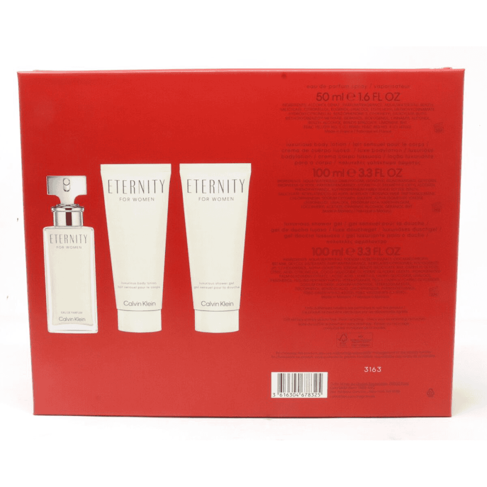 Calvin Klein Eternity Women Geschenkset – enthält Eau de Parfum 50 ml und Körperlotion. Zeitloser Blumenduft mit Noten von Freesie, Mandarine und Salbei, einem Herz aus weißer Lilie und Ringelblume, auf einer warmen Basis aus Patchouli und Sandelholz. Die Lotion spendet Feuchtigkeit und verlängert das Dufterlebnis für einen eleganten und langanhaltenden Effekt.