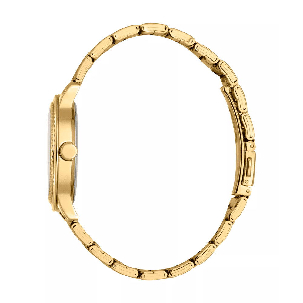 Esprit Joyce Golden Tone mit weißem Zifferblatt ist eine Damenuhr mit Quarzwerk und analoger Anzeige. Ihr 34 mm Edelstahlgehäuse mit goldfarbenem Finish harmoniert perfekt mit dem eleganten Armband aus demselben Material. Das weiße Zifferblatt wird durch Mineralglas geschützt, das Widerstandsfähigkeit und Klarheit gewährleistet. Die Uhr bietet eine HMS-Funktion (Stunden, Minuten, Sekunden) und ist bis zu 5 ATM wasserdicht, was sie zur idealen Wahl für den täglichen Gebrauch macht.